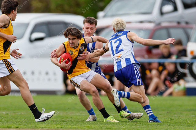 Gawler Central’s Tyler Best tries to evade a pair of tackles from Jye Gordon and Joshua Saunders. (501802_05)