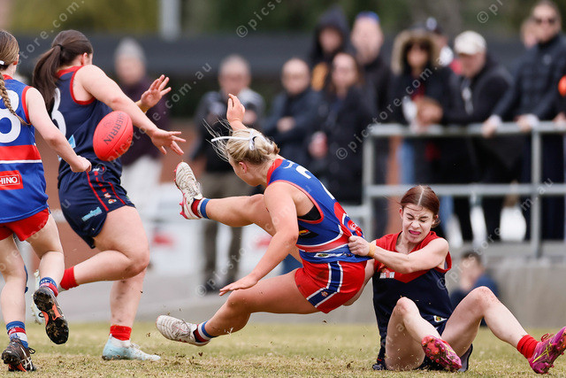 Kirra Tonkin is dragged off her kick by Reese Chamings. (501579_09)