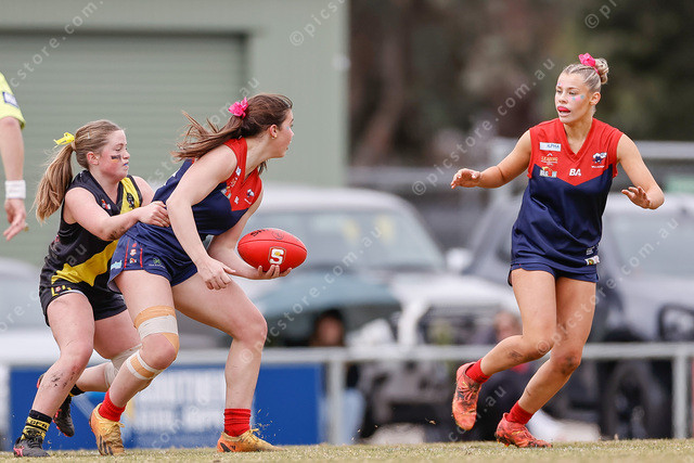 Ashleigh Heggie dishes a handball to teammate and grand final best-on-ground Sienna Antony. (501579_24)