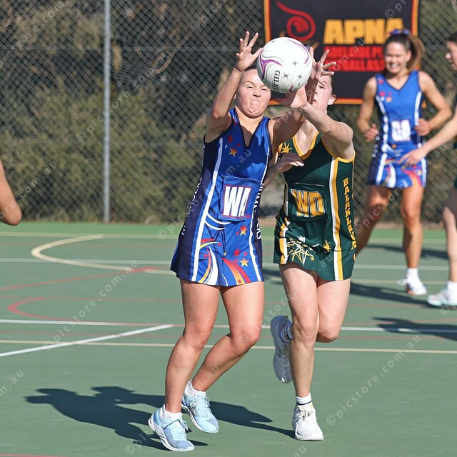 Hummocks’ Haylee Studham leads to the ball as Isla Cottle gets a hand in. (503617_02)