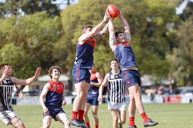 Donnybrook defenders Dylan Jones and Brodie Cormack both get hands on the same intercept mark. (503650_10)