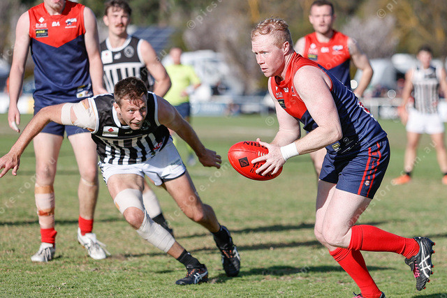 Tanunda big man Henry Voigt sets his sights on Willaston ball-carrier Ashley Fry. (503650_12)