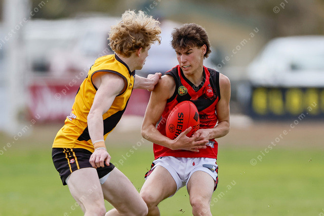 Kapunda’s Paul Rocco Herrmann shrugs off the arm-tackle from Jesse Paul. (503493_10)