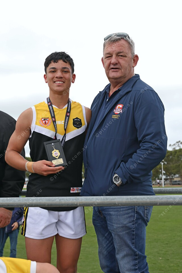 Kobe Sweetman is presented with the best-on-ground medal by SANFL’s Brad Busch. (505129_04)