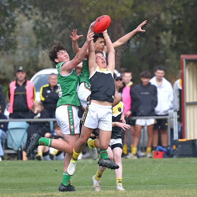 Angle Vale’s Chase Bowman bravely backs into the pack where Anthony Lazaridis and Anton Musolino come crashing in. (505129_07)