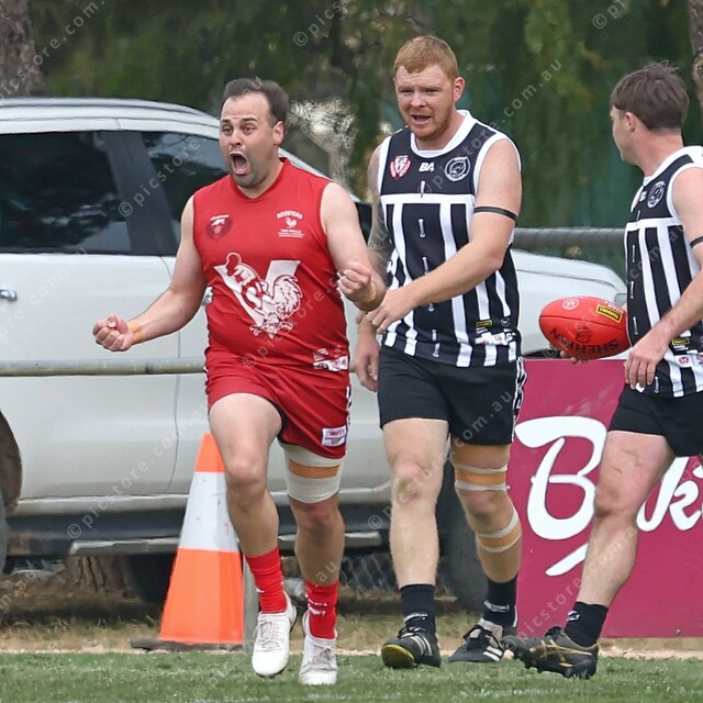 Two Wells’ Owen John celebrates one of his four goals in the reserves grand final. (505139_01)