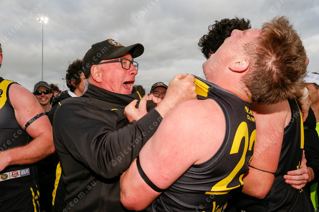 Nuriootpa’s star key defender Mitchell Norton celebrates in the scrum after the final siren. (505469_09)