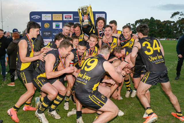 Premiership coach Nicholas Madden holds up the cup as his Tigers rush in for the official premiership photo. (Mark Willoughby: 505469_13)