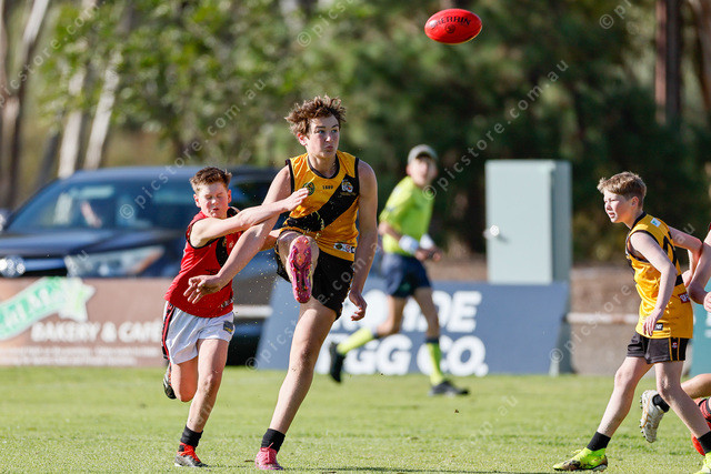 Gawler Central’s four-goal star Mitchell Semmler takes a snap at the big sticks as Toby Lindner tries to put him off. (505490_01)