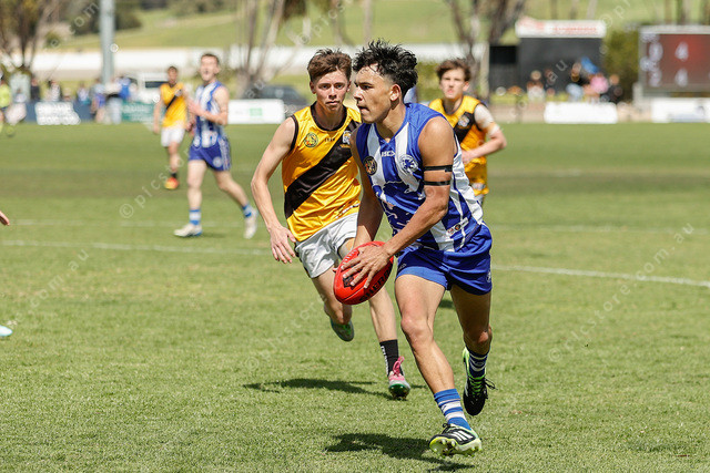 South Gawler’s Justin Miller lines up what would be a terrific left-footed goal from 40m out near the boundary. (505530_05)