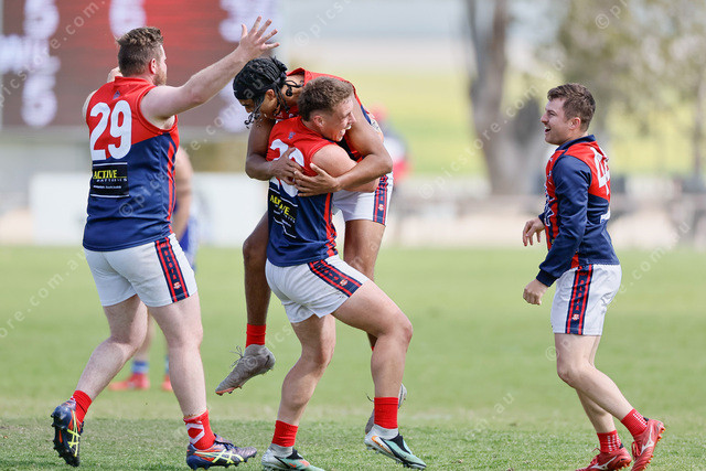 Zac East, Shannon Willis, Hudson Cole and Thomas Swain-Atkinson celebrate Willaston’s premiership win after the final siren. (505724_02)