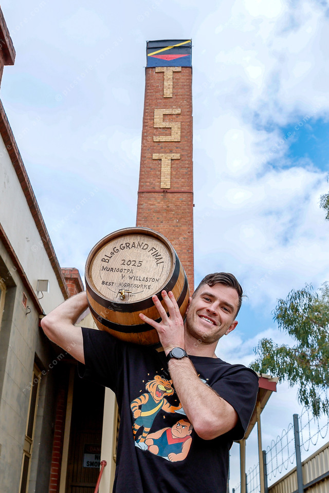 2024 Schluter Medallist Nicholas Gregurke with his specially-made keg signifying his best-on-ground performance in the grand final. (505773_02)