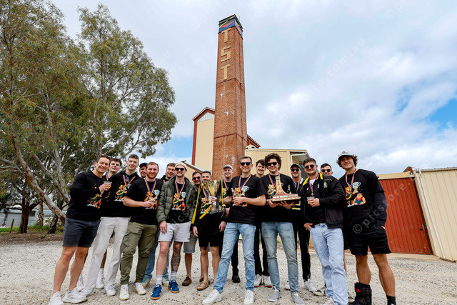 Nuriootpa’s A grade premiers celebrate in front of the Beckwith Park chimney, now painted in Tiger colours at the top. (Mark Willoughby: 505773_03)