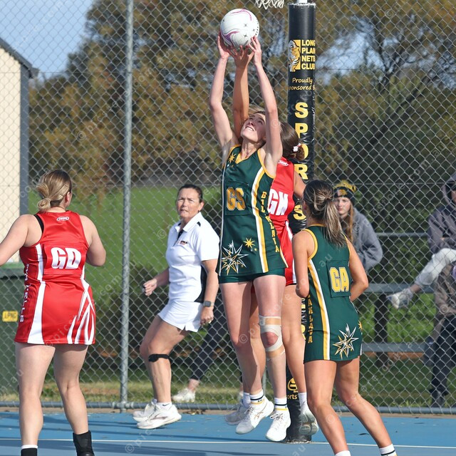 Balaklava’s star shooter Laura Daniel uses her length to pull in a high pass as defender Charli Thomson contests from behind. (499869_02)