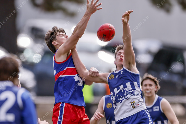 Barossa District’s Jameson Schilling battles Angaston’s Harrison Schultz in the ruck. (499888_02)