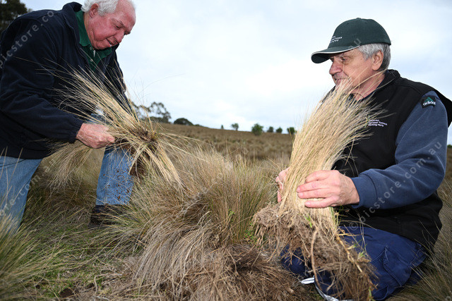 Pentland Hills Landcare group members: Peter Shilton and Joe Lesko holding some serrated tussock (an invasive plant species). Photo by Damjan Janevski. 484728_04
