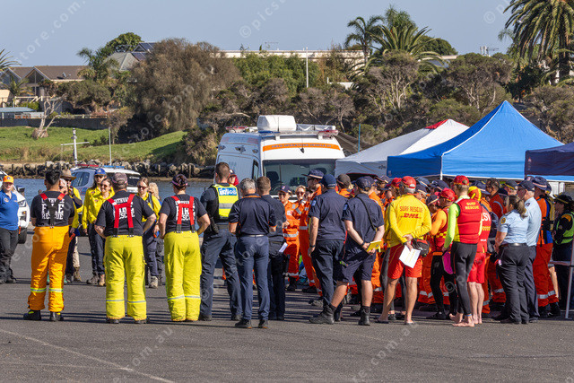 A briefing before the start of the multi emergency services training day at Patterson River Carrum.