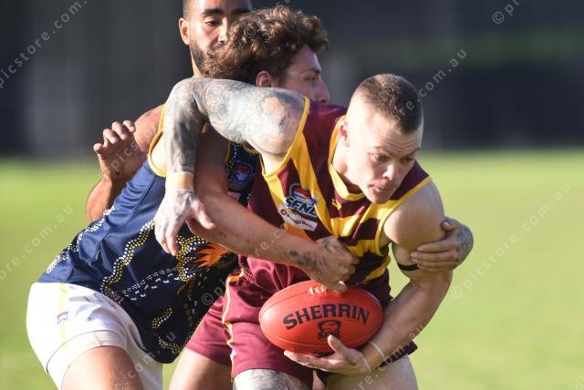 Corey Reeves (16 Lyndale) with the ball, tackled by Mitchell Oulton (19 Doveton Eagles). 348934_23