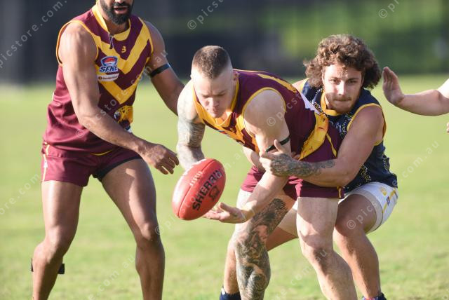 Corey Reeves (16 Lyndale) with the ball, tackled by Mitchell Oulton (19 Doveton Eagles). 348934_25