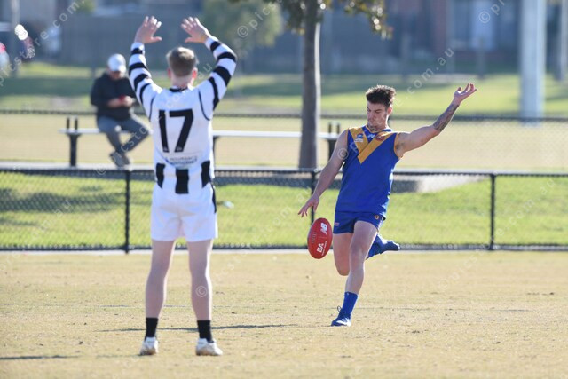 Zak Roscoe (14 Cranbourne) tries for a goal but misses. Left is Jacob Mutimer (17 NW). 485548_01