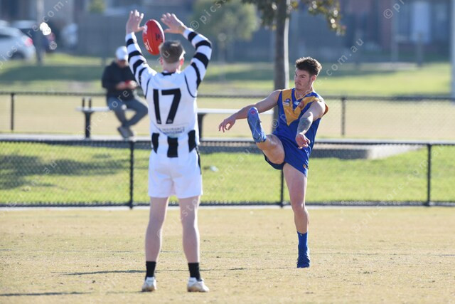 Zak Roscoe (14 Cranbourne) tries for a goal but misses. Left is Jacob Mutimer (17 NW). 485548_02