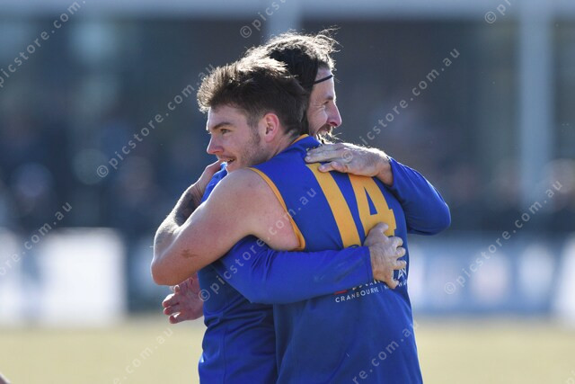 Zak Roscoe (14 Cranbourne), after his goal. Teammate Ryan Jones (17). 485548_26