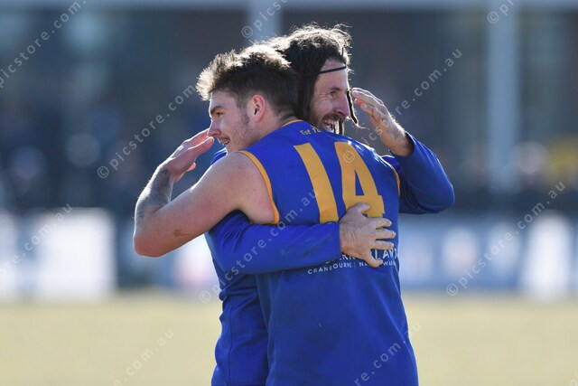 Zak Roscoe (14 Cranbourne), after his goal. Teammate Ryan Jones (17). 485548_27