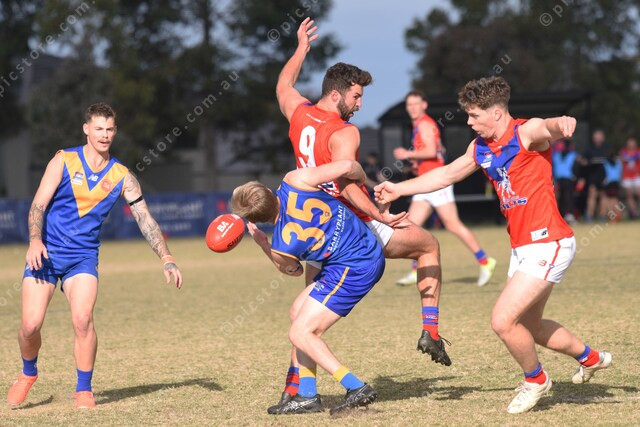 Rory Lehmann (9 Port Melbourne) falls back on Jake Hill (35 Cranbourne). 481277_09