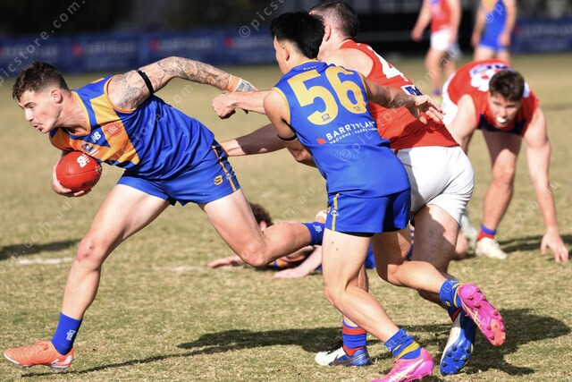 Jed Benham (38 Cranbourne) with the ball. Teammate Romeo Bellinvia (56 Cranbourne). 481277_10