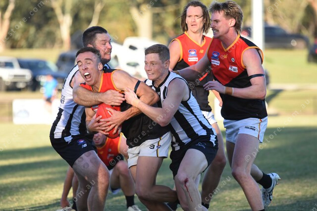 Adam Peacock (2 Dingley) with the ball, grabbed from behind by Joshua West (36 NW). 476847_02