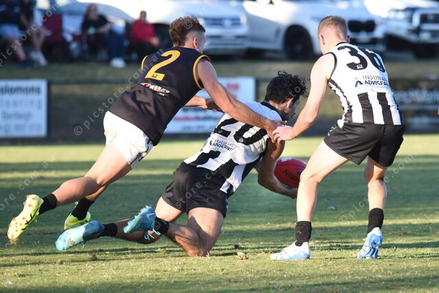 Travis Callahan (20, NW) with the ball. Teammate Joshua West (36 NW, right). Left is Adam Peacock (2 Dingley). 476847_05