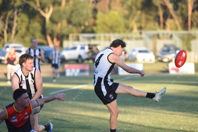 Hamish West (4 NW) about to kick a goal. Teammate behind him is Will Howe (8 NW). 476847_12