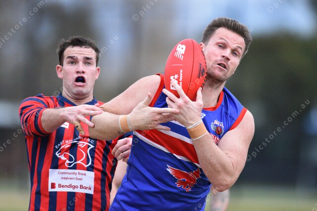 Bryce Sutton (17 Keysborough) with the ball. Left is Austin Hogan (2 East Malvern). 482712_13