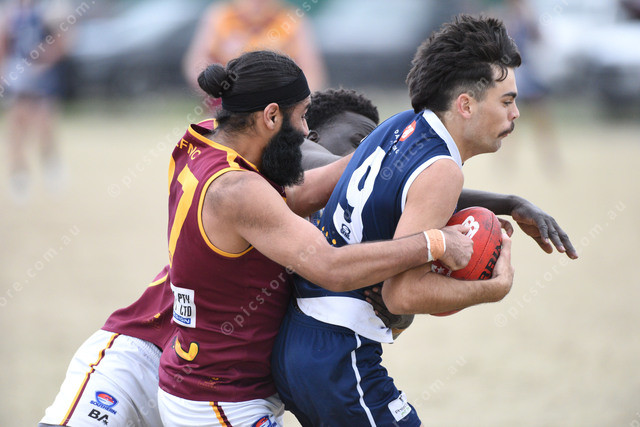 Karanbir Singh (87 Lyndale) grabs Coren Giliam (9 Dandenong West). 499261_07