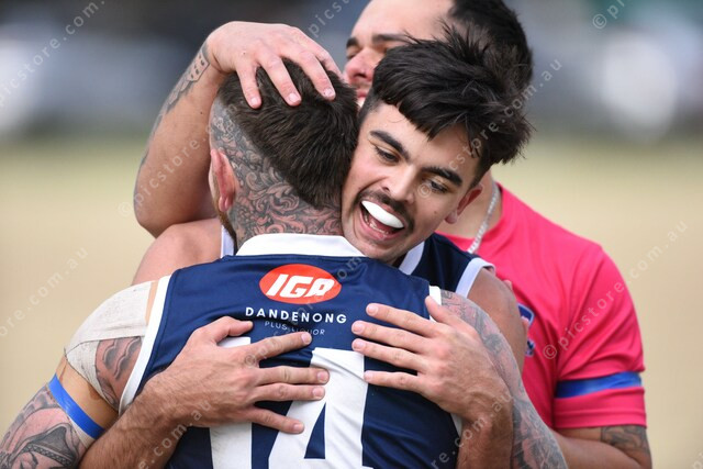 Late in the last quarter, Brenton Wells (14 Dandenong West) kicks a goal. Gets a hug from teammate Coren Giliam (9). 499261_33