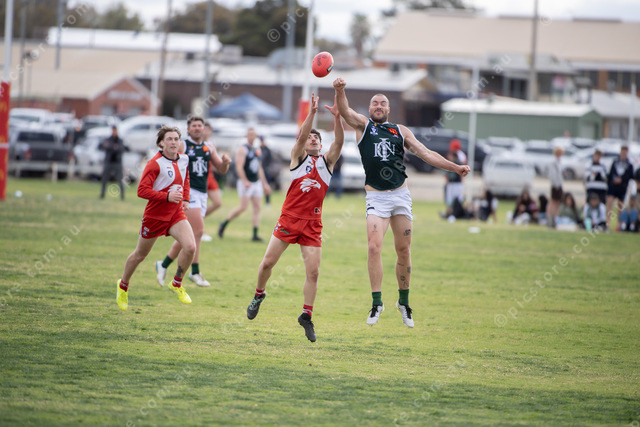 Imps midfielder Ryley Buntain spoils a marking attempt by Robinvale Euston’s Mathew Camera. Picture: Ben Gross