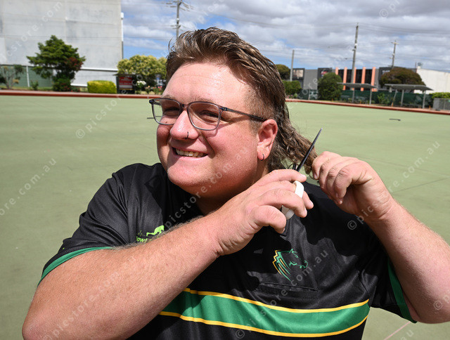 Melton Bowls Club member Harry Plias, who is soon shaving his iconic mullet to raise funds for mental health awareness. (Damjan Janevski). 528980_03