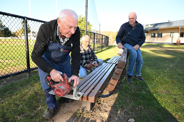 Pic of Men’s Shed members: president Eric Gunstone, and members Prakash Dhana and Phil Berchdolt; with the newly renovated spectators benches at Whittlesea Eagles Football Club. Photo by Damjan Janevski. 479210_03