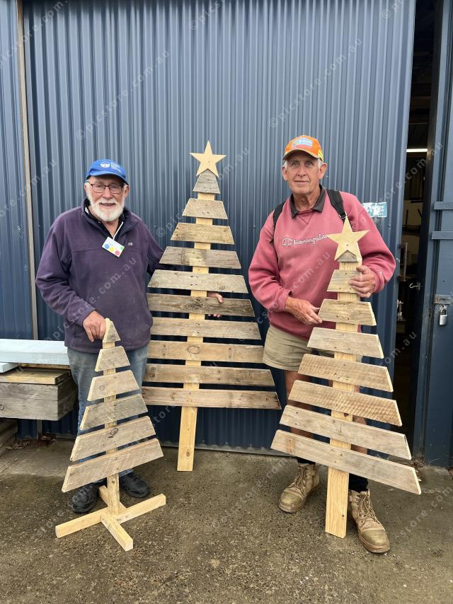 Coorong Quays Boat Shed’s John Phillips and David Schubert show off the Christmas trees some of the shed members have made and are selling. (Dani Brown: 519180_01)