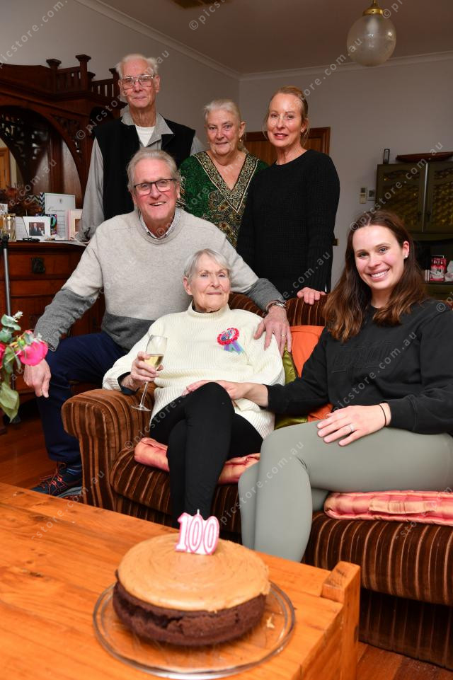 Sheila Albrecht turned 100 on May 31. Pic of Sheila and her family: sons Jon and Randy Albrecht, daughters in law Frances and Michelle Albrecht and grand daughter Zoe Scordo. Photo by Damjan Janevski. 283270_05