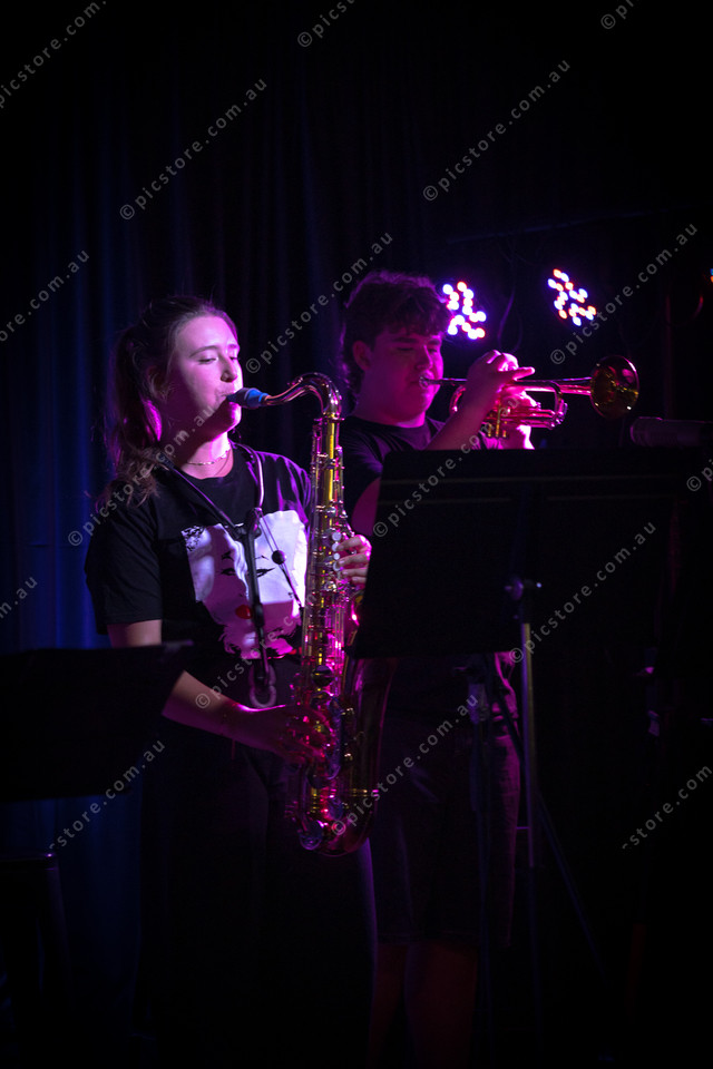 Kiarna Letton playing saxophone and Lucas Dixon playing the trumpet. (535363_06)