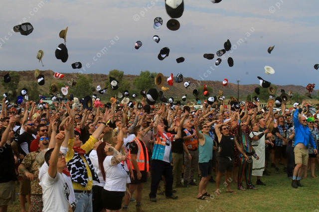 HATS OFF: Crews toss their hats into the air after the driver’s briefing on Saturday morning. (PIC: PHIL WILLIAMS 512919_04)