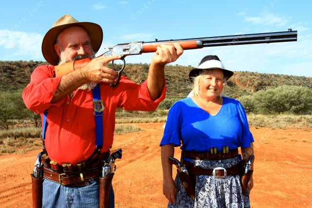 Doug Waters with a shotgun and Lucinda Wright after their recent success at the Australian Single Action Nationals. PICTURE PHIL WILLIAMS 374309_02