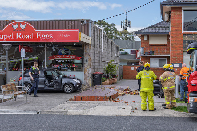 A car mounted the footpath hit a shop (Egg Shop) and knocked down a wall of the units next to the shop. It was around 1:30pm when I got there.
