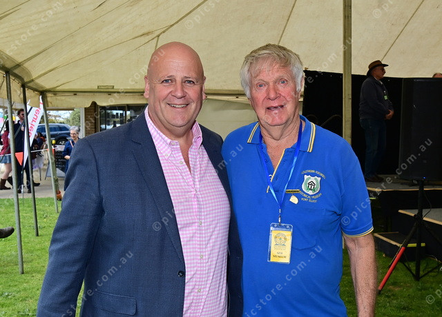 Member for Finniss David Basham is with Deane Perry, who has been a volunteer at the Port Elliot Show for 50 years. (512380_09).