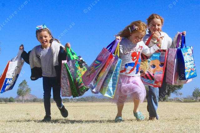 STAMPEDE: Rosie, Frankie and Eva race away with some showbags available at the show. (PIC: PHIL WILLIAMS 486944_06