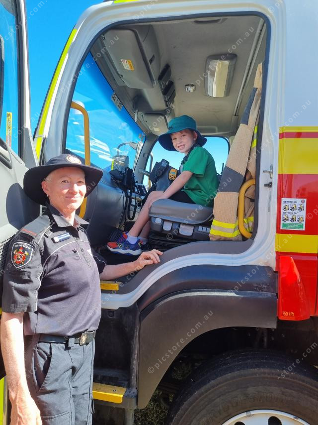 Denise from QFES shows Jones Hill student Justice Gallaher one of Gympie’s Fire Trucks.