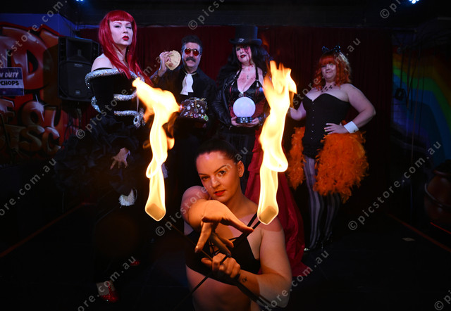 Sins of the West is a Halloween extravaganza at Pride of Footscray. Pic of Rhiannon Thompson (front), Cassidy La Creme, Benni Hutton, producer Angelina Lester and Kitten Kaboodle. (Damjan Janevski). 512424_05
