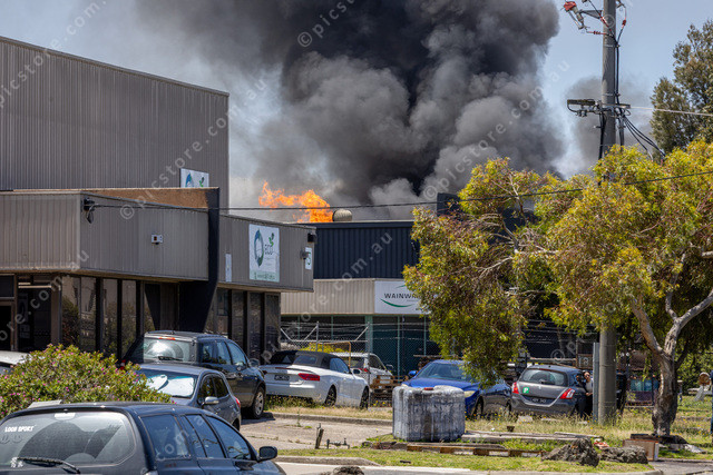 A factory fire at Kimberley Rd Dandenong South, flames and smoke from the roof. This was just before the evacuation of the street. Hammond Rd was cordoned off both ways for traffic entering.
