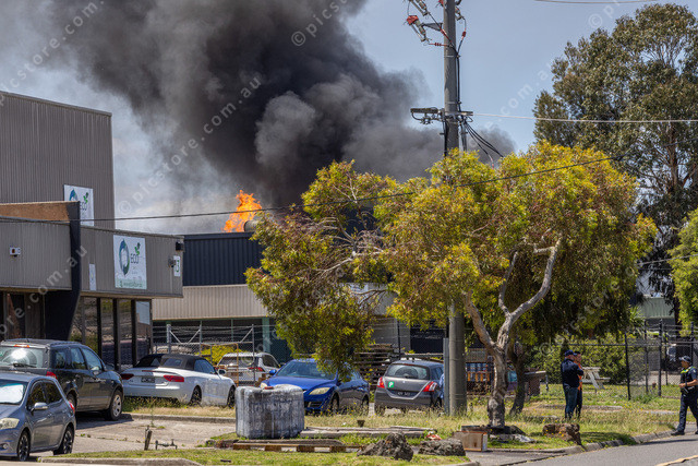 A factory fire at Kimberley Rd Dandenong South, flames and smoke from the roof.